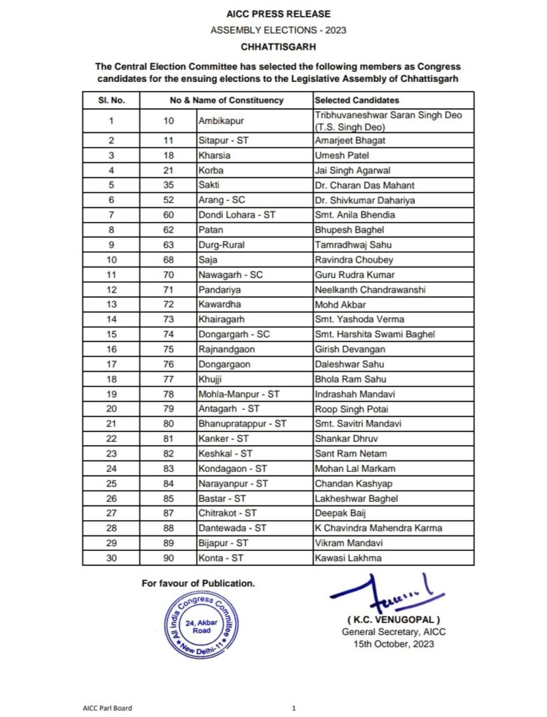 छत्तीसगढ़ उम्मीदवारों की पहली लिस्ट में मुख्यमंत्री भूपेश बघेल अपनी वर्तमान विधानसभा सीट पाटन से ही चुनाव लड़ेंगे