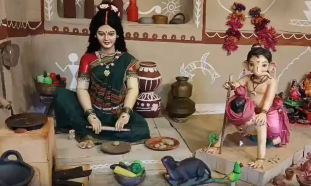 ”पंडाल मिट्टी और घास-फूस खादर से निर्मित घर के रूप में बनाया, छत्तीसगढ़ी सभ्यताओं पर आधारित पूजा पंडाल, भगवान गणेश को अपने बाल सखा के पीठ पर सवारी करते दिखाया.’