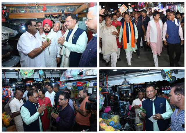 नवरात्रि पर्व के शुभ अवसर पर मुख्यमंत्री विष्णु देव साय ने राजधानी रायपुर के एम.जी. रोड एवं आसपास के प्रमुख बाजारों का भ्रमण कर व्यापारियों और उपभोक्ताओं से आत्मीय संवाद किया।