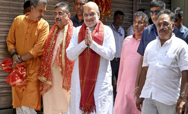 गृह मंत्री शाह शुक्रवार सुबह कालीघाट मंदिर गए और मां काली की पूजा की।