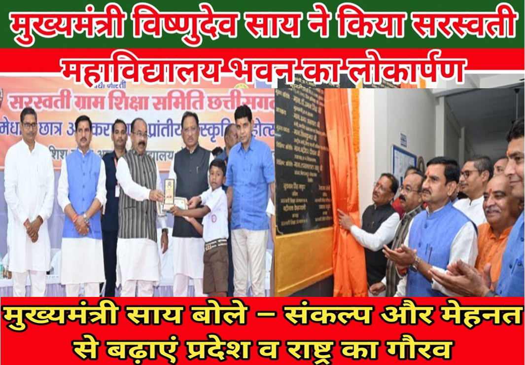 बिलासपुर में सरस्वती महाविद्यालय भवन का लोकार्पण मुख्यमंत्री श्री साय बिलासपुर के कोनी स्थित सरस्वती शिशु मंदिर परिसर पहुँचे और वहाँ नव-निर्मित सरस्वती महाविद्यालय भवन का लोकार्पण किया। इस अवसर पर विद्या भारती द्वारा आयोजित भव्य सम्मान समारोह में प्रदेश के 33 जिलों से चयनित 24 मेधावी छात्रों को सम्मानित किया गया। साथ ही सांस्कृतिक गतिविधियों और महोत्सवों में उत्कृष्ट प्रदर्शन करने वाले विद्यार्थियों को भी पुरस्कृत किया गया।