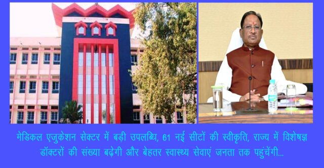 छत्तीसगढ़ में मेडिकल एजुकेशन सेक्टर में बड़ी उपलब्धि हासिल हुई है। राष्ट्रीय चिकित्सा आयोग यानि एनएमसी ने राज्य के विभिन्न शासकीय चिकित्सा महाविद्यालयों में एमडी-एमएस (चिकित्सा स्नातकोत्तर) की 61 नई सीटों की स्वीकृति प्रदान की है।