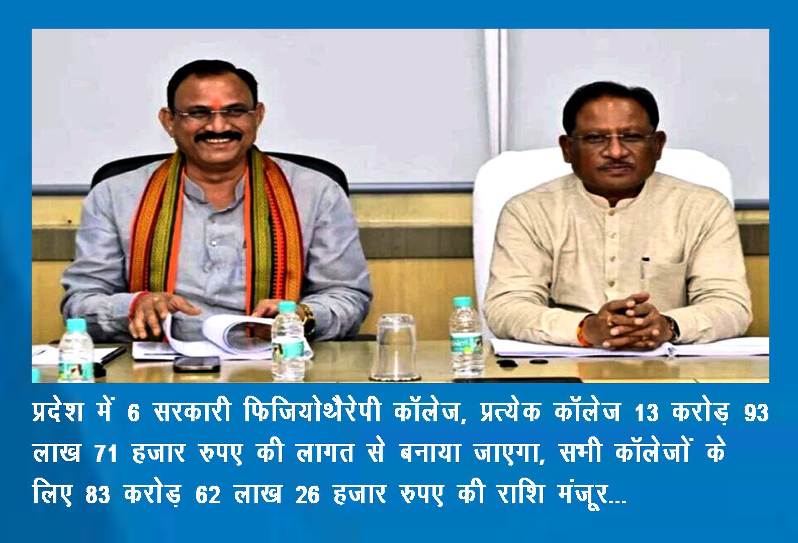 प्रदेश में 6 सरकारी फिजियोथैरेपी कॉलेज बनेगा। प्रत्येक कॉलेज 13 करोड़ 93 लाख 71 हजार रुपए की लागत से बनाया जाएगा। हालांकि पढ़ाई अगले साल से शुरू होने की संभावना है। ये कॉलेज मनेंद्रगढ़, जशपुर, रायगढ़, बिलासपुर, दुर्ग एवं जगदलपुर में खुलेंगे। सभी कॉलेजों के लिए 83 करोड़ 62 लाख 26 हजार रुपए की राशि मंजूर की गई है।