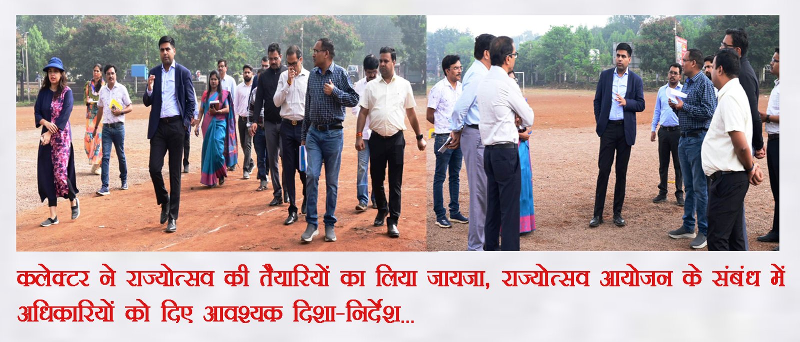 कलेक्टर श्री जितेन्द्र यादव ने आज स्टेट हाई स्कूल मैदान में राज्योत्सव की तैयारियों का जायजा लिया। कलेक्टर श्री यादव ने शासकीय योजनाओं पर आधारित विभिन्न विभागों द्वारा लगाए जाने वाले स्टाल के संबंध में आवश्यक निर्देश दिए। उन्होंने जिले में किए गए उल्लेखनीय कार्यों के संबंध में अच्छी प्रदर्शनी लगाने कहा। उन्होंने मंच, बैठक व्यवस्था, पार्किंग व्यवस्था, एन्ट्री गेट एवं अन्य तैयारियों की जानकारी ली। उन्होंने राज्योत्सव आयोजन के संबंध में अधिकारियों को आवश्यक दिशा-निर्देश दिए। इस अवसर पर सीईओ जिला पंचायत सुश्री सुरूचि सिंह, अपर कलेक्टर श्री सीएल मारकण्डेय, अपर कलेक्टर श्री प्रेम प्रकाश शर्मा, अतिरिक्त पुलिस अधीक्षक श्री राहुल शर्मा, नगर निगम आयुक्त श्री अतुल विश्वकर्मा सहित अन्य अधिकारी उपस्थित थे।