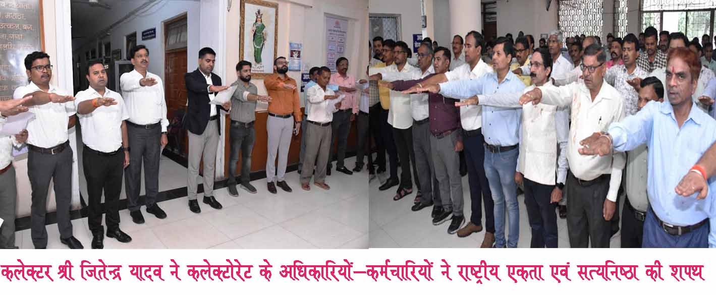 राजनांदगांव। भारत के प्रथम उप प्रधानमंत्री एवं गृह मंत्री, भारत रत्न सरदार वल्लभ भाई पटेल के जन्मदिवस तथा राष्ट्रीय एकता दिवस के अवसर पर कलेक्टर श्री जितेन्द्र यादव ने कलेक्टोरेट के अधिकारियों-कर्मचारियों ने राष्ट्रीय एकता एवं सत्यनिष्ठा की शपथ दिलाई। सभी अधिकारियों-कर्मचारियों ने राष्ट्र की एकता, अखण्डता और सुरक्षा को बनाए रखने की शपथ ली। सभी ने देश की आंतरिक सुरक्षा सुनिश्चित करने के लिए अपना योगदान देने का संकल्प लिया। इस अवसर पर अपर कलेक्टर श्री सीएल मारकण्डेय, अपर कलेक्टर श्री प्रेम प्रकाश शर्मा सहित विभिन्न विभाग के अधिकारी-कर्मचारी उपस्थित थे।