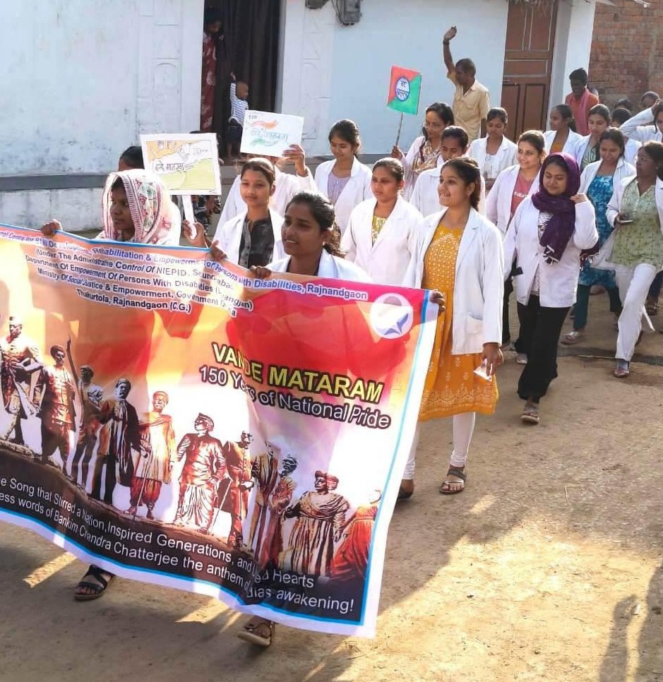 राजनांदगांव। वंदे मातरम् की 150वीं वर्षगांठ के अवसर पर प्रधानमंत्री श्री नरेन्द्र मोदी ने देशवासियों को संबोधित किया। कार्यक्रम का समेकित क्षेत्रीय केन्द्र (सीआरसी) ठाकुरटोला में सीधा प्रसारण दिखाया गया। इस दौरान देशभक्ति, राष्ट्रीय चेतना की भावना को संजोए हुए सभी ने सीधे प्रसारण के साथ वंदे मातरम् राष्ट्रगीत का सामूहिक गायन किया। इस दौरान डिप्लोमा इन इंडियन साइन लैंग्वेज इंटरप्रिटेशन (डीआईएसएलआई) पाठ्यक्रम के छात्रों ने राष्ट्रगीत वंदे मातरम् को सांकेतिक भाषा में प्रस्तुत किया। जिससे समावेशन और एकता की भावना का प्रदर्शन हुआ। छात्रों द्वारा भारत थीम पर आधारित एक भव्य रंगोली बनाई गई। सुश्री निधि द्वारा वंदे मातरम् के ऐतिहासिक एवं सांस्कृतिक महत्व पर प्रकाश डालते हुए प्रश्नोत्तरी प्रतियोगिता और जागरूकता सत्र का आयोजित किया गया।