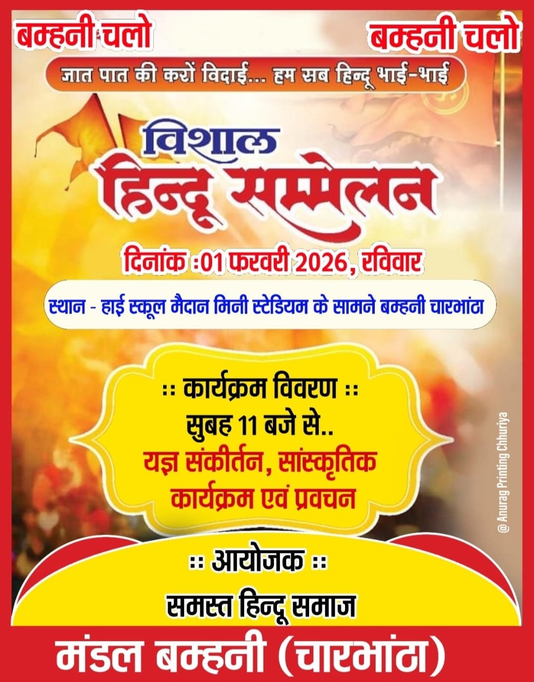 छुरिया। ब्लॉक मुख्यालय से 6 किलोमीटर की दूरी पर स्थित ग्राम बम्हनी-चारभांठा में आगामी 1 फरवरी, रविवार को विराट हिंदू सम्मेलन का आयोजन किया जा रहा है। यह सम्मेलन सुबह 10 बजे से लेकर शाम 4 बजे तक चलेगा। इस ऐतिहासिक कार्यक्रम की शुरुआत हिंदू देवी-देवताओं के तैलचित्र पर पूजा-अर्चना से की जाएगी।