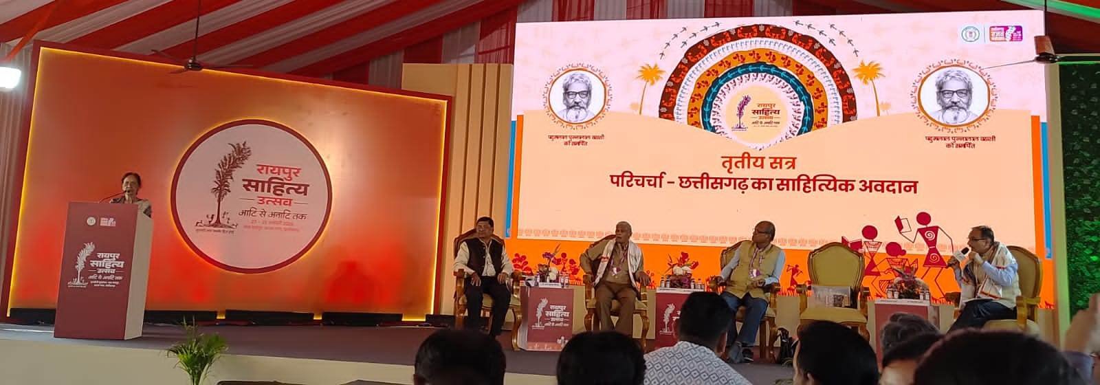 साहित्य उत्सव के प्रथम दिन राजनांदगांव के प्रख्यात इतिहासकार व साहित्यकार डॉ. चन्द्र शेखर शर्मा को छत्तीसगढ़ के साहित्यिक अवदान पर केन्दि्रत एक महत्वपूर्ण सत्र में अभिभाषण हेतु आमंत्रित किया गया था। डॉ. शर्मा ने हिंदी साहित्य के व्योम में छत्तीसगढ़ के नक्षत्र विषय पर श्याम लाल चतुर्वेदी पंडाल में अपना वक्तव्य दिया। इस सत्र में उन्होंने सूत्रधार की महती भूमिका भी निभाई। सत्र में कहानीकार डॉ. सरला शर्मा, कवि माणिक विश्वकर्मा, आलोचक डॉ. मनिकेतन प्रधान व छंद विशेषज्ञ अरूण कुमार निगम ने सहभागिता की। संस्कारधानी के डॉ. चंद्र शेखर शर्मा ने अपने वक्तव्य में राजनांदगांव के साहित्यिक योगदान के अलावा यहां के साहित्य सेवियों पर चर्चा कर पूरे पंडाल के समक्ष राजनांदगांव की मजबूत नींव का रहस्य बताया। अपने प्रवर्तन विषय हिंदी साहित्य के व्योम में छत्तीसगढ़ के नक्षत्र पर बोलते हुए उन्होंने कहा कि छत्तीसगढ़ की माटी भाषाओं के प्रति उदार रही है। छत्तीसगढ़ी के साथ-साथ हिंदी भाषा और साहित्य में छतीसगढ़ और उसमें भी राजनांदगांव का योगदान उल्लेखनीय है। राजनांदगांव साहित्य की तीन अलग-अलग धाराओं के संगम के कारण हिंदी साहित्य की त्रिवेणी है। यह डॉ. पदुमलाल पुन्नालाल बख्शी, गजानन माधव मुक्तिबोध एवं डॉ. बल्देव प्रसाद मिश्र की प्रिय कर्मस्थली रही। गजानन माधव मुक्तिबोध ने अपने जीवन का स्वर्णिम सृजन राजनांदगांव में ही कर पाए, क्योंकि यहां उनको उनके अनुकूल परिस्थितियां मिलीं। इसी प्रकार बिलासपुर में लोचन प्रसाद पाण्डेय ने छायावाद का प्रवर्तन किया। वे छायावाद के प्रवर्तक हैं। इसी श्रृंखला में हिंदी की पहली कहानी लिखने की प्रेरणा भी इसी धरती से माधवराव सप्रे को मिली। छतीसगढ़ का योगदान हिंदी साहित्य में विशेष उल्लेखनीय है।