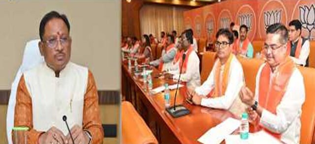 राजधानी रायपुर स्थित बीजेपी मुख्यालय में प्रदेश संगठन की बड़ी बैठक आयोजित की गई… नई टीम के गठन के बाद यह पहला बड़ा शक्ति प्रदर्शन भी माना जा रहा है. बैठक में मुख्यमंत्री विष्णु देव साय, संगठन महामंत्री अजय जामवाल और प्रदेश अध्यक्ष किरण सिंह देव समेत कई वरिष्ठ नेता मौजूद रहे.