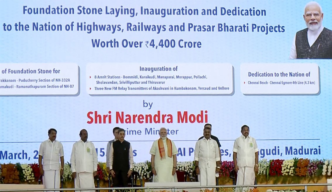 प्रधानमंत्री नरेंद्र मोदी ने मदुरै में 4,400 करोड़ रुपये से अधिक की लागत वाली विभिन्न अवसंरचना परियोजनाओं का उद्घाटन और शिलान्यास किया। इन परियोजनाओं का मुख्य उद्देश्य संपर्क में सुधार, आवागमन को सुगम बनाना और क्षेत्रीय आर्थिक विकास को प्रोत्साहित करना है।