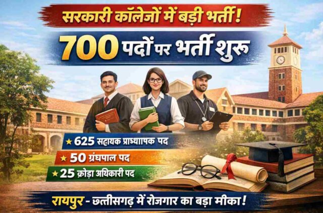 मुख्यमंत्री श्री विष्णु देव साय की विशेष पहल पर राज्य के शासकीय महाविद्यालयों में शिक्षण एवं सहायक सेवाओं को सुदृढ़ बनाने के उद्देश्य से उच्च शिक्षा विभाग द्वारा विभिन्न शैक्षणिक पदों पर भर्ती की प्रक्रिया प्रारंभ कर दी गई है। विभाग द्वारा सहायक प्राध्यापक के 625 पद, ग्रंथपाल के 50 पद तथा क्रीड़ा अधिकारी के 25 पदों सहित कुल 700 पदों पर भर्ती की जाएगी।