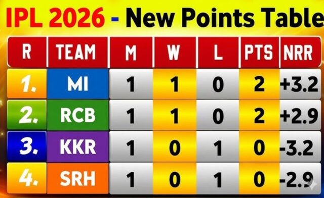 अंक तालिका में राजस्थान रॉयल्स पहले स्थान पर है, जबकि आरसीबी दूसरे स्थान पर है। इसके बाद दिल्ली कैपिटल्स, मुंबई इंडियंस, पंजाब किंग्स और SRH क्रमशः 2-2 अंकों के साथ मौजूद हैं।