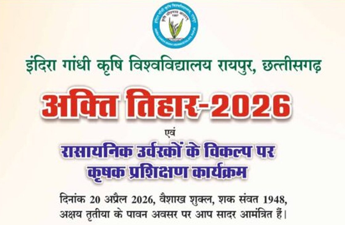 इंदिरा गांधी कृषि विश्वविद्यालय में अक्षय तृतीया के अवसर पर कल ‘‘अक्ती तिहार’’ का आयोजन किया जा रहा है। स्वामी विवेकानंद कृषि अभियांत्रिकी महाविद्यालय एवं अनुसंधान केन्द्र के पास स्थित प्रक्षेत्र में प्रातः 10ः30 बजे से आयोजित राज्य स्तरीय अक्ती तिहार समारोह के मुख्य अतिथि कृषि मंत्री श्री रामविचार नेताम होंगे। समारोह की अध्यक्षता इंदिरा गांधी कृषि विश्वविद्यालय के कुलपति डॉ. गिरीश चंदेल करेंगे।